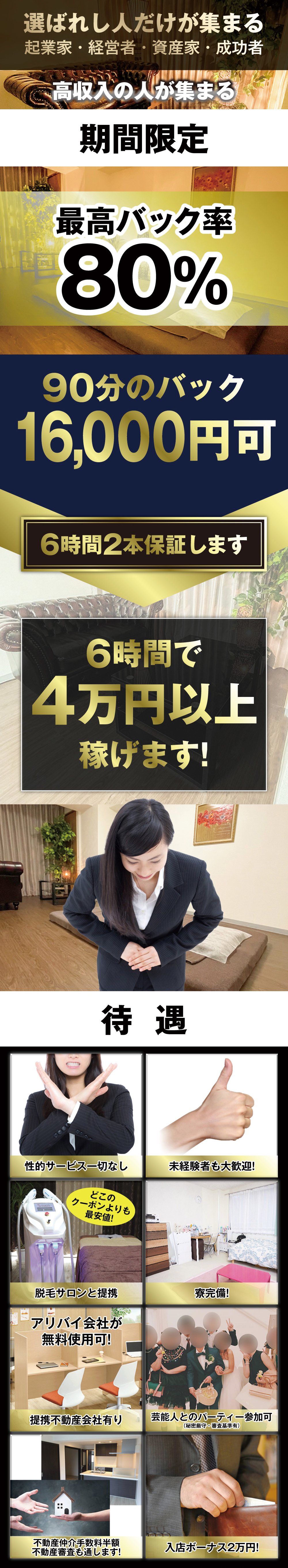 ■90分コース12,000円 ■120分コース16,000円 保証制度有り バック率最大85% 本指名フルバック